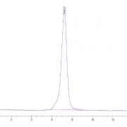 The protein has a predicted MW of 67.6 kDa. Due to glycosylation, the protein migrates to 80-110 kDa based on Tris-Bis PAGE result.