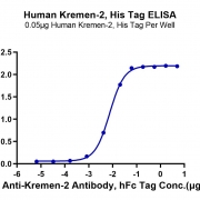 Immobilized Human Kremen-2, His Tag at 0.5ug/ml (100ul/well) on the plate. Dose response curve for Anti-Kremen-2 Antibody, hFc Tag with the EC50 of 7.5ng/ml determined by ELISA. See testing image for detail.