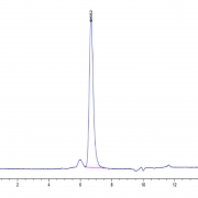 The protein has a predicted MW of 46.6 kDa. Due to glycosylation, the protein migrates to 40-60 kDa&12-13 kDa based on Tris-Bis PAGE result.