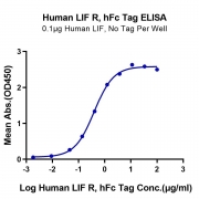 Immobilized Human LIF, No Tag at 1ug/ml (100ul/Well) on the plate. Dose response curve for Human LIF R, hFc Tag with the EC50 of 0.39ug/ml determined by ELISA. See testing image for detail.