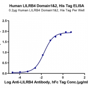 Immobilized Human LILRB4 Domain 1&2, His Tag at 2ug/ml (100ul/Well) on the plate. Dose response curve for Anti-LILRB4 Antibody, hFc Tag with the EC50 of 18.2ng/ml determined by ELISA. See testing image for detail.