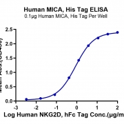 Immobilized Human MICA, His Tag at 1ug/ml (100ul/Well) on the plate. Dose response curve for Human NKG2D, hFc Tag with the EC50 of 0.88ug/ml determined by ELISA (QC Test). See testing image for detail.