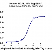 Immobilized Human NGAL, hFc Tag at 0.5ug/ml (100ul/Well) on the plate. Dose response curve for Biotinylated Anti-NGAL Antibody, hFc Tag with the EC50 19.7ng/ml determined by ELISA. See testing image for detail.