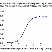 Immobilized Anti-NY-ESO-1 (HLA-A*02:01) Antibody at 5μg/ml (100μl/well) on the plate. Dose response curve for Human NY-ESO-1 (HLA-A*02:01) , His Tag with the EC50 of 7.2ng/ml determined by ELISA. See testing image for detail.