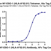 Immobilized Human NY-ESO-1 (HLA-A*02:01) Tetramer, His Tag at 5μg/ml (100μl/well) on the plate. Dose response curve for Anti-NY-ESO-1 (HLA-A*02:01) Antibody, hFc Tag with the EC50 of 7.0ng/ml determined by ELISA. See testing image for detail.
