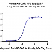 Immobilized Human OSCAR, hFc Tag at 1ug/ml (100ul/Well) on the plate. Dose response curve for Biotinylated Anti-OSCAR Antibody, hFc Tag with the EC50 19.2ng/ml determined by ELISA. See testing image for detail.