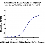 Immobilized Human PRAME (HLA-A*02:01) , His Tag at 2ug/ml (100ul/well) on the plate. Dose response curve for Anti-PRAME (HLA-A*02:01) Antibody, hFc Tag with the EC50 of 54.2ng/ml determined by ELISA. See testing image for detail.