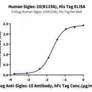 Immobilized Human Siglec-10 (R119A) , His Tag at 0.5ug/ml (100ul/well) on the plate. Dose response curve for Anti-Siglec-10 (R119A) Antibody, hFc Tag with the EC50 of 19.8ng/ml determined by ELISA. See testing image for detail.