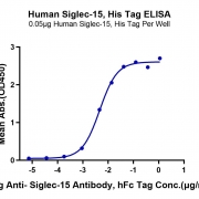 Immobilized Human Siglec-15, His Tag at 0.5ug/ml (100ul/well) on the plate. Dose response curve for Anti-Siglec-15 Antibody, hFc Tag with the EC50 of 4.6ng/ml determined by ELISA. See testing image for detail.