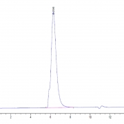 The protein has a predicted MW of 73.1 kDa. Due to glycosylation, the protein migrates to 90-115 kDa based on Tris-Bis PAGE result.