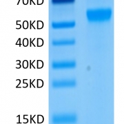 The protein has a predicted MW of 40.7 kDa. Due to glycosylation, the protein migrates to 50-60 kDa based on Tris-Bis PAGE result.