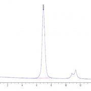 The protein has a predicted MW of 38.9 kDa. Due to glycosylation, the protein migrates to 70-80 kDa based on Tris-Bis PAGE result.