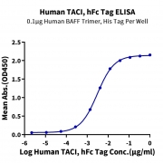 Immobilized Human BAFF Trimer, His Tag at 1ug/ml (100ul/well) on the plate. Dose response curve for Human TACI, hFc Tag with the EC50 of 3.0ng/ml determined by ELISA. See testing image for detail.