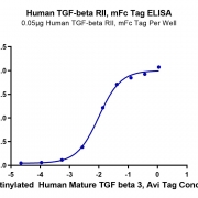 Immobilized Human TGF-beta RII, mFc Tag at 0.5ug/ml (100ul/well) on the plate. Dose response curve for Biotinylated Human Mature TGF beta 3, Avi Tag with the EC50 of 9.9ng/ml determined by ELISA (QC Test). See testing image for detail.