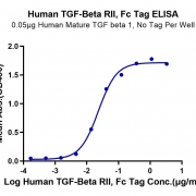 Immobilized Human Mature TGF beta 1 at 0.5ug/ml (100ul/Well) on the plate. Dose response curve for Human TGF-beta RII, hFc Tag with the EC50 of 23.2ng/ml determined by ELISA. See testing image for detail.