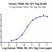 Immobilized Human TRAIL at 1ug/ml (100ul/well) on the plate. Dose response curve for Human TRAIL R2, hFc Tag with the EC50 of 20ng/ml determined by ELISA. See testing image for detail.