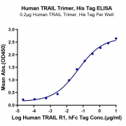 Immobilized TRAIL Trimer, His Tag at 2ug/ml (100ul/well) on the plate. Dose response curve for Human TRAIL R1, hFc Tag with the EC50 of 49.2ng/ml determined by ELISA. See testing image for detail.