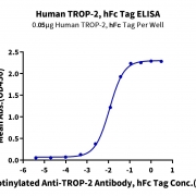 Immobilized Human TROP-2, hFc Tag at 0.5ug/ml (100ul/well) on the plate. Dose response curve for Biotinylated Anti-TROP-2 Antibody, hFc Tag with the EC50 of 11.3ng/ml determined by ELISA. See testing image for detail.