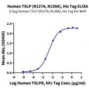 Immobilized Human TSLP (R127A, R130A) , His Tag at 5ug/ml (100ul/Well). Dose response curve for Human TSLPR, hFc Tag with the EC50 of 4.7ng/ml determined by ELISA (QC Test). See testing image for detail.