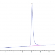 The protein has a predicted MW of 82.88 kDa. Due to glycosylation, the protein migrates to 100-120 kDa based on Tris-Bis PAGE result.