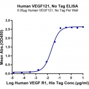 Immobilized Human VEGF121, No Tag at 0.5ug/ml (100ul/well) on the plate. Dose response curve for Human VEGF R1, His Tag with the EC50 of 21.7ng/ml determined by ELISA. See testing image for detail.