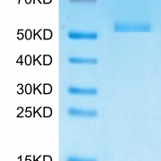 The protein has a predicted MW of 32.92 kDa. The protein migrates to 50-60 kDa based on Tris-Bis PAGE result.