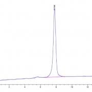 The protein has a predicted MW of 33 kDa. Due to glycosylation, the protein migrates to 55-65 kDa based on Tris-Bis PAGE result.