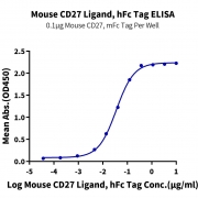 Immobilized Mouse CD27, mFc Tag at 1ug/ml (100ul/Well) on the plate. Dose response curve for Mouse CD27 Ligand, hFc Tag with the EC50 of 35.5ng/ml determined by ELISA. See testing image for detail.