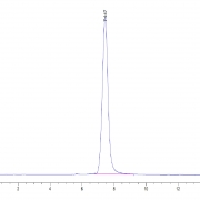 The protein has a predicted MW of 49 kDa. Due to glycosylation, the protein migrates to 50-55 kDa based on Tris-Bis PAGE result.