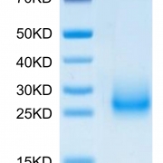 The protein has a predicted MW of 15.3 kDa. Due to glycosylation, the protein migrates to 25-28 kDa based on Tris-Bis PAGE result.
