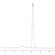 The protein has a predicted MW of 46.3 kDa. Due to glycosylation, the protein migrates to 60-65 kDa based on Tris-Bis PAGE result.