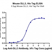 Immobilized Mouse DLL3, His Tag at 5ug/ml (100ul/well) on the plate. Dose response curve for Anti-DLL3 Antibody, hFc Tag with the EC50 of 6.5ng/ml determined by ELISA. See testing image for detail.
