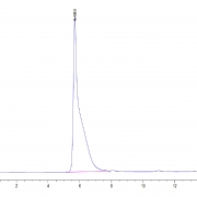 The protein has a predicted MW of 63.7 kDa. Due to glycosylation, the protein migrates to 75-80 kDa based on Tris-Bis PAGE result.