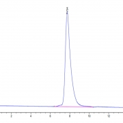 The protein has a predicted MW of 42.15 kDa. Due to glycosylation, the protein migrates to 55-65 kDa based on Tris-Bis PAGE result.