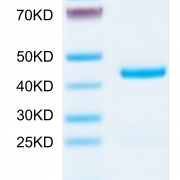 The protein has a predicted MW of 35.1 kDa. The protein migrates to 42-46 kDa based on Tris-Bis PAGE result.