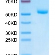 The protein has a predicted MW of 41.42 kDa. Due to glycosylation, the protein migrates to 50-60 kDa based on Tris-Bis PAGE result.