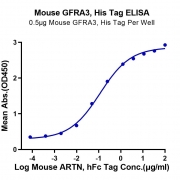 Immobilized Mouse GFRA3, His Tag at 5ug/ml (100ul/Well) on the plate. Dose response curve for Mouse ARTN, hFc Tag with the EC50 of 0.12ug/ml determined by ELISA. See testing image for detail.