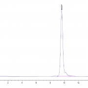 The protein has a predicted MW of 42.2 kDa. Due to the protein cleaved into the following two chains, so it migrates to 18-22 kDa and 30 kDa based on Tris-Bis PAGE result.