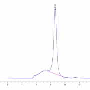 The protein has a predicted MW of 38.4 kDa. Due to glycosylation, the protein migrates to 50-70 kDa based on Tris-Bis PAGE result.