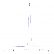 The protein has a predicted MW of 42.2 kDa. Due to glycosylation, the protein migrates to 55-65 kDa based on Tris-Bis PAGE result.