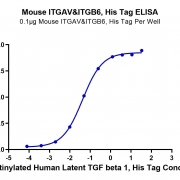 Immobilized Mouse ITGAV&ITGB6, His Tag at 1ug/ml (100ul/Well) on the plate. Dose response curve for Biotinylated Human Latent TGF beta 1, His Tag with the EC50 of 41.8ng/ml determined by ELISA (QC Test). See testing image for detail.