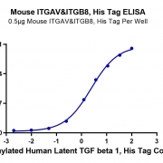 Immobilized Mouse ITGAV&ITGB8, His Tag at 5ug/ml (100ul/Well) on the plate. Dose response curve for Biotinylated Human Latent TGF beta 1, His Tag with the EC50 of 2.4ug/ml determined by ELISA. See testing image for detail.