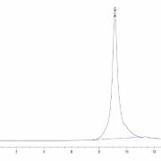 The protein has a predicted MW of 29.9 kDa. Due to glycosylation, the protein migrates to 40-50 kDa based on Tris-Bis PAGE result.