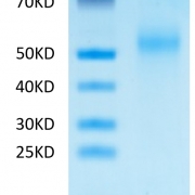 The protein has a predicted MW of 37.4 kDa. Due to glycosylation, the protein migrates to 50-60 kDa based on Tris-Bis PAGE result.