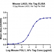 Immobilized Mouse LAG3, His Tag at 2ug/ml (100ul/Well) on the plate. Dose response curve for Mouse FGL1, hFc Tag with the EC50 of 0.18ug/ml determined by ELISA. See testing image for detail.