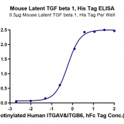 Immobilized Mouse Latent TGF beta 1, His Tag at 5ug/ml (100ul/well) on the plate. Dose response curve for Biotinylated Human ITGAV&ITGB6, hFc Tag with the EC50 of 0.59ug/ml determined by ELISA. See testing image for detail.