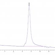 The protein has a predicted MW of 38.2 kDa. Due to glycosylation, the protein migrates to 58-110 kDa based on Tris-Bis PAGE result.