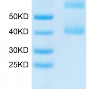 The protein has a predicted MW of 45.3 kDa. The protein is cleaved into 2 chains and due to glycosylation, it migrates to 45-60 kDa based on Tris-Bis PAGE result.