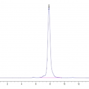 The protein has a predicted MW of 42.4 kDa. Due to glycosylation, the protein migrates to 36 kDa and 52-57 kDa based on Tris-Bis PAGE result.