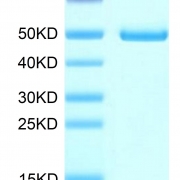 The protein has a predicted MW of 42.9 kDa. Due to glycosylation, the protein migrates to 48-51 kDa based on Tris-Bis PAGE result.